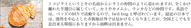 成虫は羽化後半日ぐらいで交尾が可能となり、4〜5日後に第1回目の産卵をします。8日程度で孵化して幼虫となり、吸血して4〜5日で1回目の脱皮を行います。5〜6週間で5回脱皮し成虫となります。脱皮して成虫になる不完全変態なので、若虫は成虫によく似た形をしています。吸血は幼虫期の各令毎に1回以上行い、成虫になると1〜2日毎に吸血します。吸血後によく交尾をします。そして毎日だらだらと5〜6個の産卵を続けます。一匹の雌が産む卵の数は約200個です。寿命は22〜27℃で3〜5ヵ月です。通常夜間に吸血を行い、満腹すると元の場所に戻る習性があります。糞は潜伏している場所の中にはせず、入口から外へ排出します。そのため穴の周囲が汚れていますから、それが潜伏場所の目印となります。昼間は床の隙間や壁、柱の隙間、壁紙の裏、畳の敷き合わせ目、ベッド等の隠れ場所に潜入しています。臭線が後肢の根元の部分にあり、外敵防除のため非常に臭い液を出します。 |