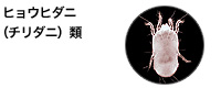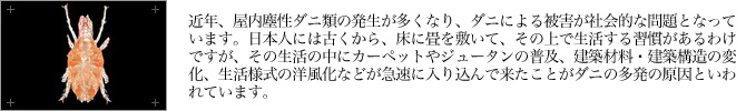 屋内塵性ダニの70〜90%を占めるのが、コナヒョウヒダニとヤケヒョウヒダニで、ジュータンや寝具等に多く居ます。大発生した場合、これらのダニの成虫、死骸、脱皮殻、糞などが、吸入アレルゲンとして種々のアレルギー疾患の原因となっていますが、人を刺したりすることはありません。体長は0.3mm内外の小さなダニで、餌は人のフケや食べ物の残渣などです。最適の条件は、温度25℃、